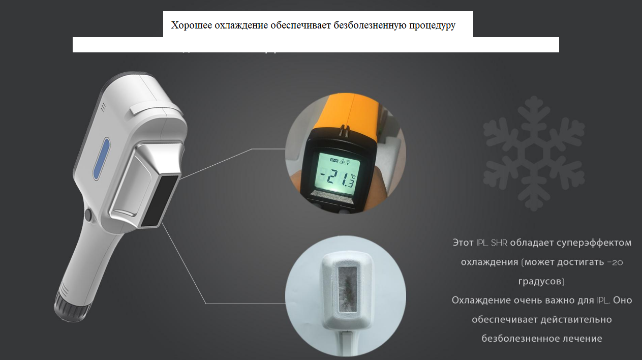 - система охлаждения тканей с минимальной температурой в зоне фотоэпиляции до -10°C;