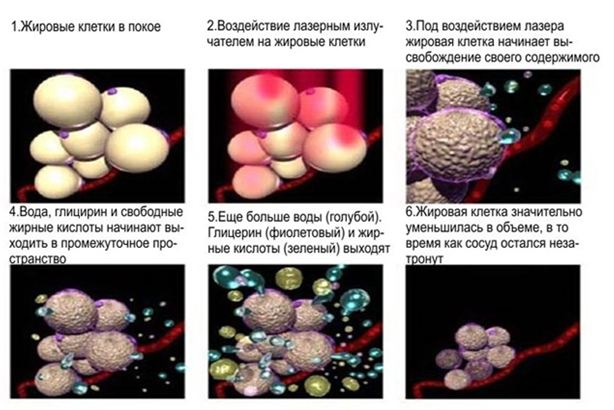 Многочисленные клинические исследования доказали, что подкожная жировая ткань чувствительна именно к данной длине волны. Липолазер стимулирует жировые клетки к тому, чтобы они начали разжижать жир, содержащийся внутри них. Разжиженный жир проходит сквозь оболочку жировой клетки в так называемое межклеточное пространство. Из него жир отводится в лимфатическую (выводящую) систему.